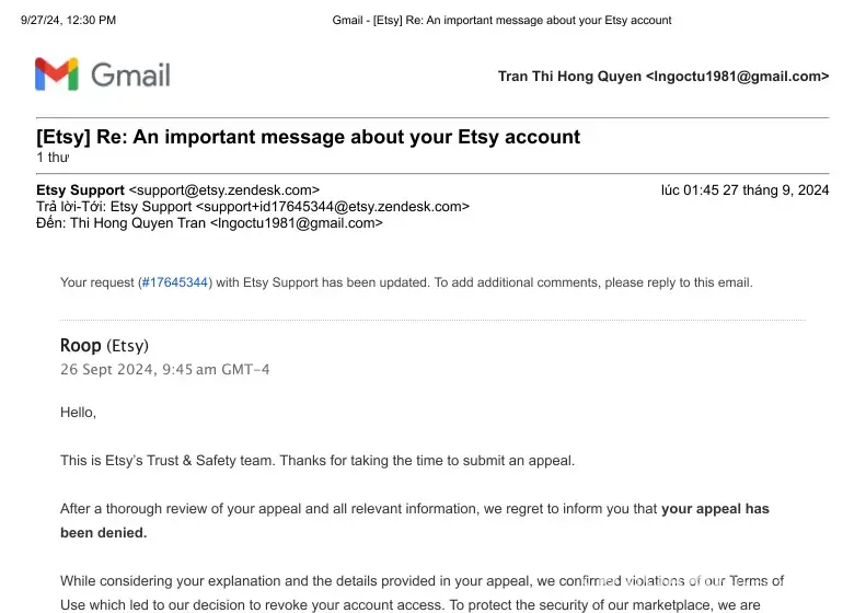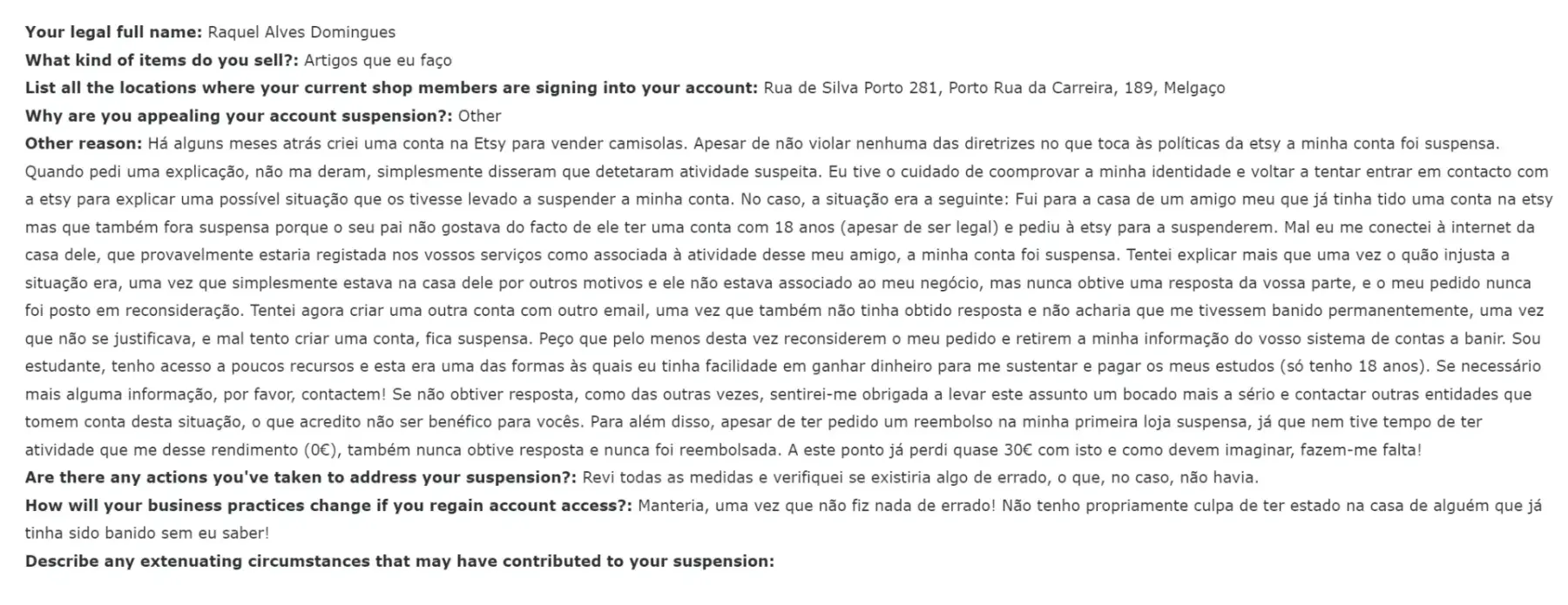 We just opened an Etsy shop on April *, 2020 after invested for our business and worked really hard to produce like 200 unique handcrafted jewelry in our studio. We took photos of the each products and listed each jewelry with at least 3-4 photos and clear descriptions. We offered free international expedited shipping for buyers to fast and secure deliver and we made 115 sales within 45 days with 15 high rating feedbacks from buyers. We haven't received any single case against our shop, no low rating feedback or buyer complaints in these 45 days. Etsy has been suspended our account on May , 2020 without sending us any single warning or explanation email ragarding this suspension. We immediately called Etsy to understanding this suspension. The Etsy worker which we have talked on phone was very kind person but he doesn't gave us any suspension reason. We have created a support request through Etsy and emailed them below message to Etsy Integrity Team. *** We have received a reply from Etsy Legal 4 days after than our email to Etsy Integrity Team. They are telling that they have suspended our account due to policy violations. Etsy claims also as "Our records show that your account shares sufficient information with an account whose privileges have been revoked for us to consider them related. As a result, we’ve terminated your account privileges as well." After received this email from Etsy Legal, we have contacted (called) with our virtual assistant in US and they confirmed they was working with a different Etsy shop owner and their account has been also suspended just couple of days before our suspension. As we mentioned above too, we were working with a virtual assistant for arranging our financements in the US until two months. They just signed in to our account to pay our first Etsy bill yesterday and our account has been suspended just in two minutes after she paid Etsy bill. We never asked to our virtual assistant if they were working with the different people to running their business on Etsy or not ! As it is understood our failure was just working with a virtual assistant. We never violeted any Etsy policy, not received any buyer complaint as well. We made huge investments to establish our jewelry studio, worked very hard to produce unique and handcrafted jewelry, spended months to do that all. But our account has been suspended for a reason that happens out of our control. We never thought that the virtual assistant was working with the other Esty shop owners and their accounts has been suspended due to policy violations. Now our account is still suspended. We are loosing business and time due to suspension because of device match with the others we never related. We are requesting to reviewing our account again. We are not related with any other accounts and we want to keep running our Etsy business. Sincerely yours