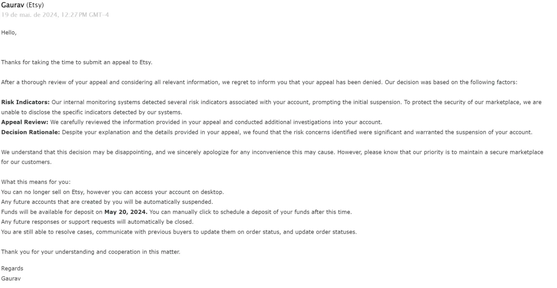 Additionally, we explained that this decision is final, and we will be unable to respond to any further outreach about your account. As mentioned, our Terms of Use state that we may terminate an account (and any related accounts) at any time, for any reason, and without advance notice.