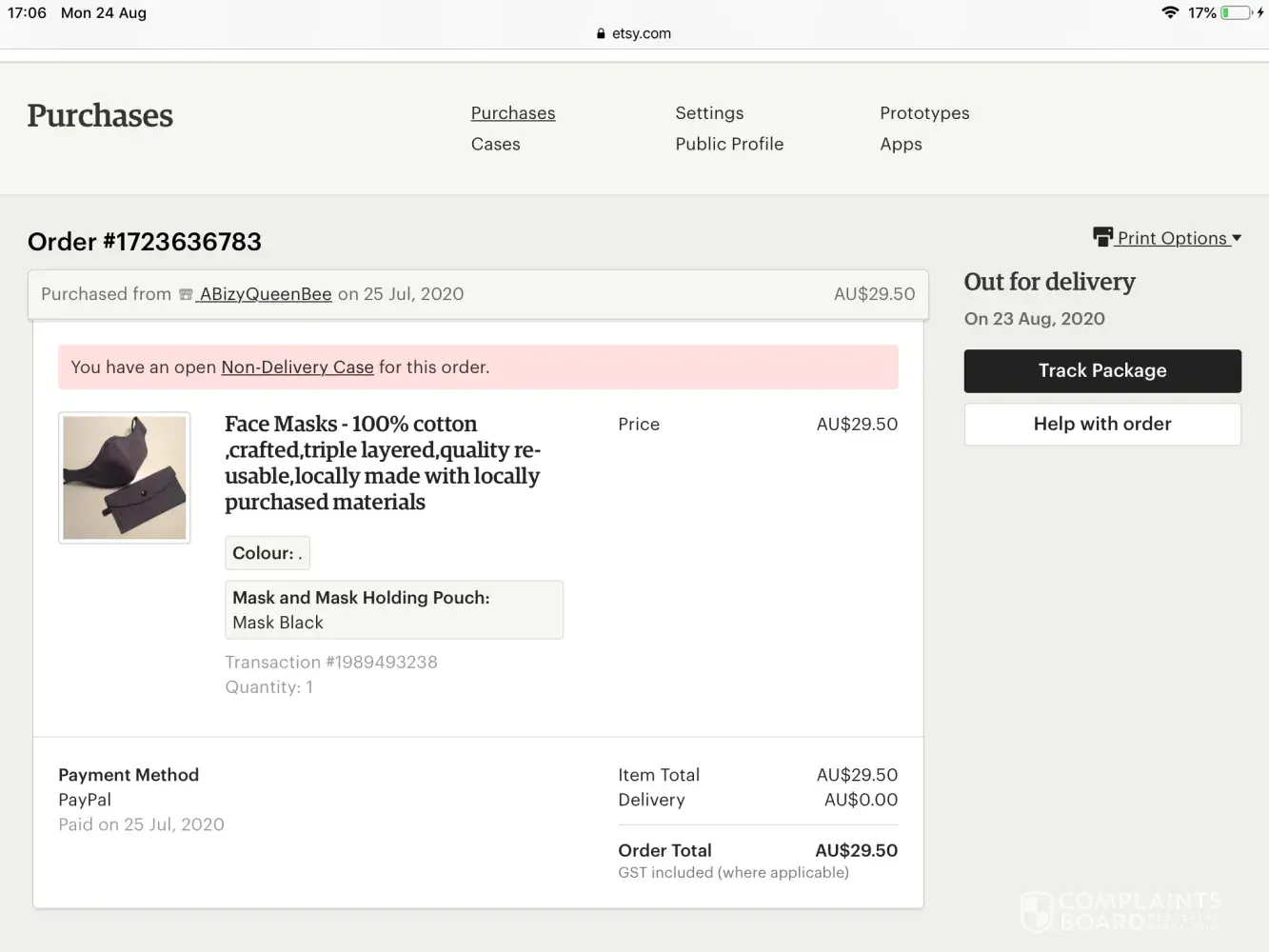 I bought a face mask plus pouch from abizyqueenbee (alias thumbsupaustralia) via etsy web page on 26th july. Item did not turn up by 18th august. Wrote numerous requests to the seller via etsy with no helpful reply at all. I raised a case via etsy on the 18th detailing non-arrival and non-help from the seller. Suddenly seller says it was returned to them and resent it with a tracking number this time (none before). Item finally arrived on 24th august, face mask was there, but no accompanying pouch. I then received an email from etsy closing the case.