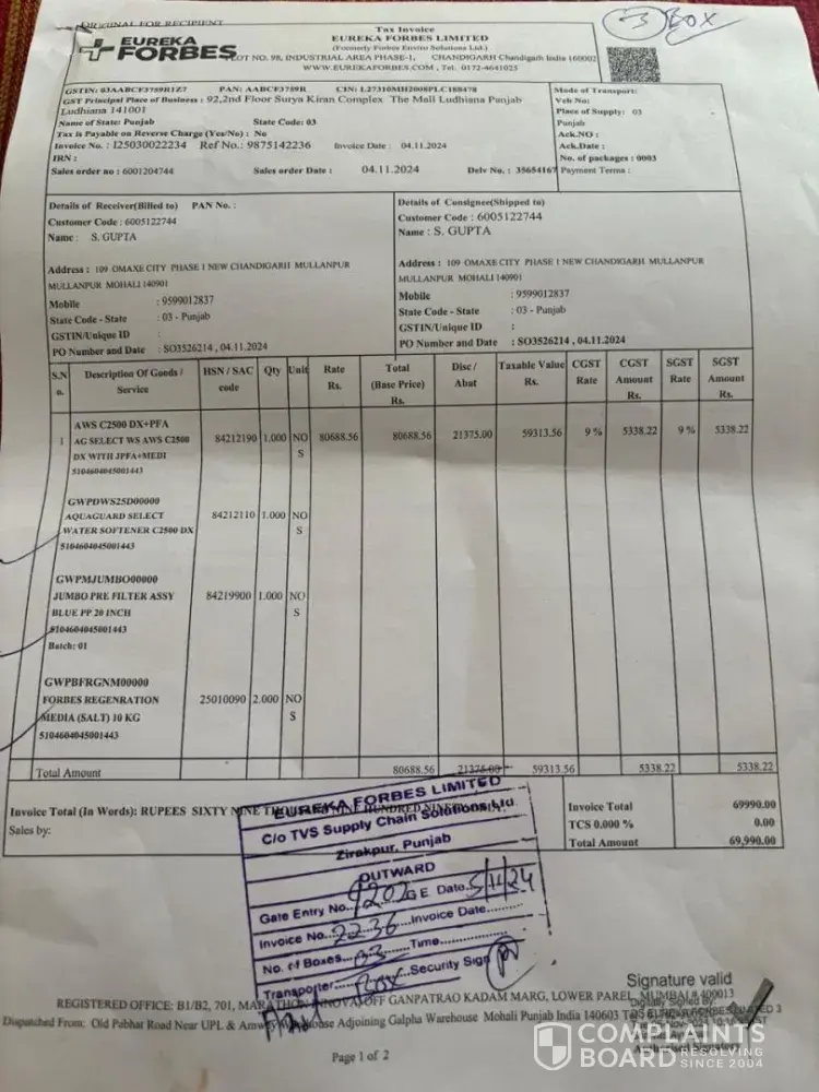 t was most disappointing to see the performance of Eureka Forbes. I ordered for water softener in New Chandigarh. One Mr. Narendra Sharma (phone [protected]) (very eagerly took the order, and I paid the entire amount. A copy of the order is enclosed. The technician on behalf of Eureka Forbes, one Mr. Alam, (([protected]) was nominated; he turns up after five...