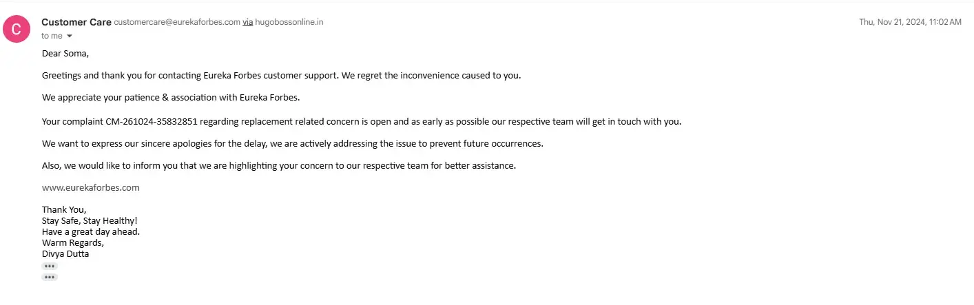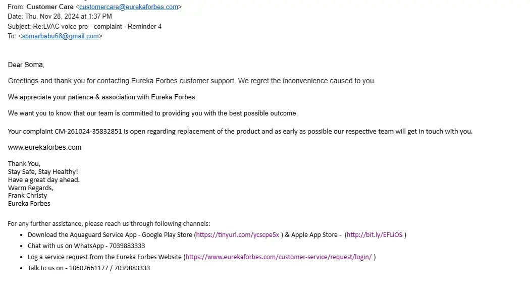 I lodged a complaint regarding AMC for my Aquagaurd to customercare@eurekaforbes.com.To my surprise I used to get a mail daily from different so-called customer reps mentioning '' Greetings and thank you for contacting Eureka Forbes customer support. We regret the inconvenience caused to you.