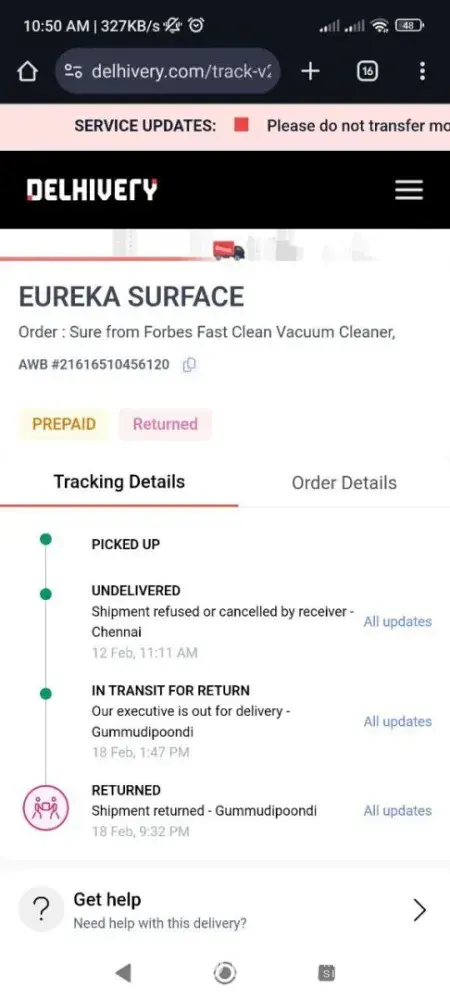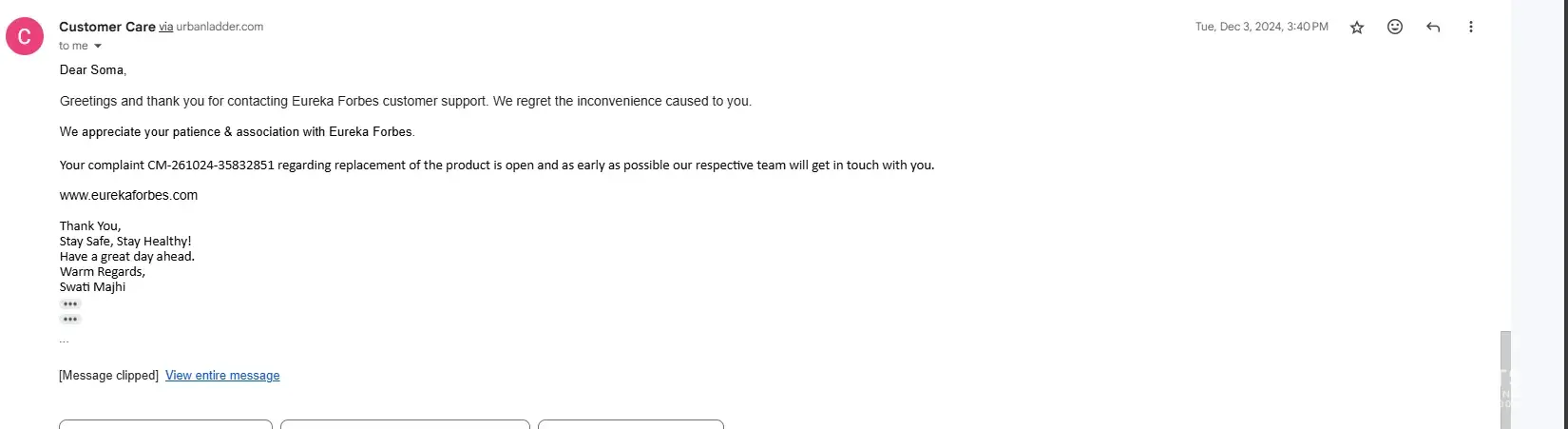 I had order water purify order id: dnc1k8cv69258312 from eureka forbes official website and when technician came to installed, he said the item is defective and not work you need to replace the item. I raised replacement and from 4 days I am e=waiting for eureka forbes executive to call and arrange pick up and send new item but there is no response from them. We are waiting from 5 days to get it resolved.