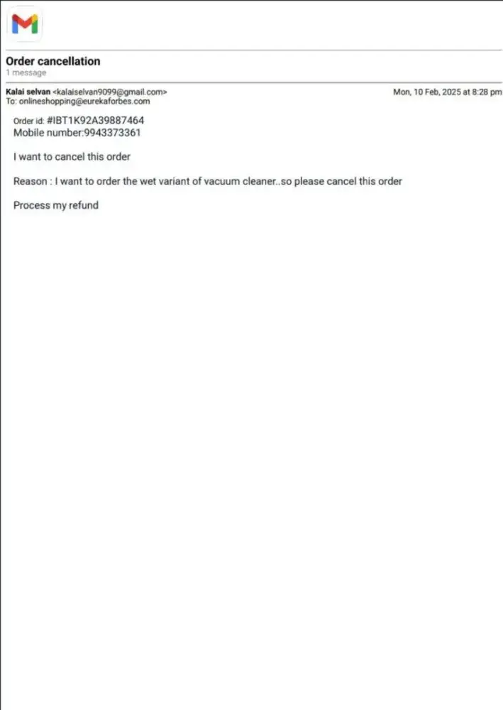 I have the product AQUASURE MAIMA + RO+UF+ME. I bought AMC for this product on 27th April 2025 though Eureka Forbes App (Rs.3499 through phone pe) and raise a service request for filter change on same day. On 1st may your technician V HEMADASU (Cell: 8919469412) attended and he told that "the motor was damaged and the product was unable to repair and also he told me that he raise a request to cancel AMC and it would be refund to the account". As he said he cancelled the AMC on the same day. But refund is not done still today. My mail id [protected]@gmail.com & mobile number [protected]