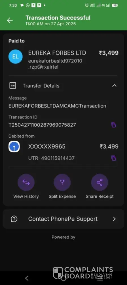 Eureka Forbes AMC refund which was paid on 27th April 2025 complaint no: CM-[protected]