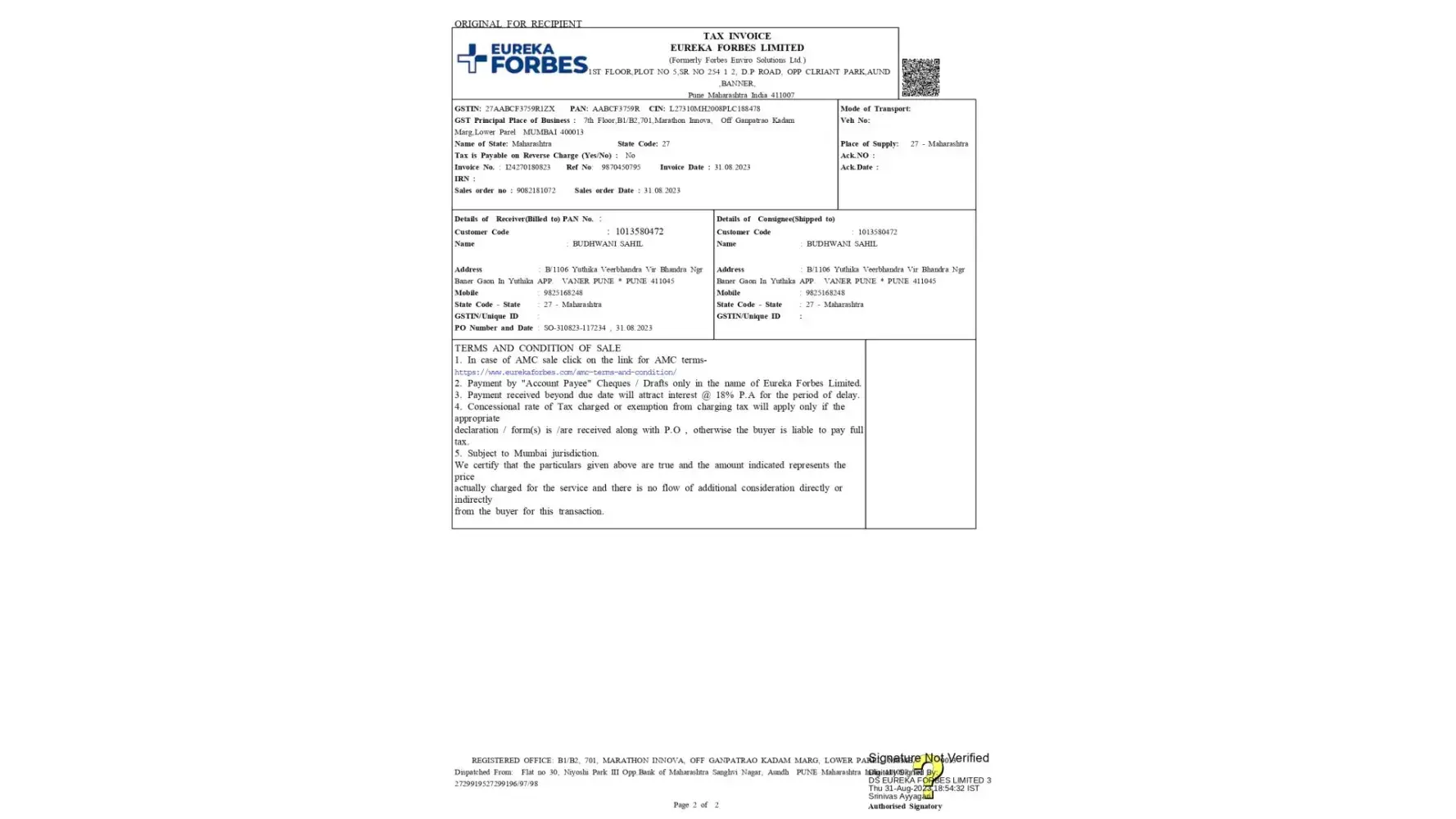 I purchased the AMC silver plan from EUREKA FORBES LIMITED on 31st August, 2023 (document attached).