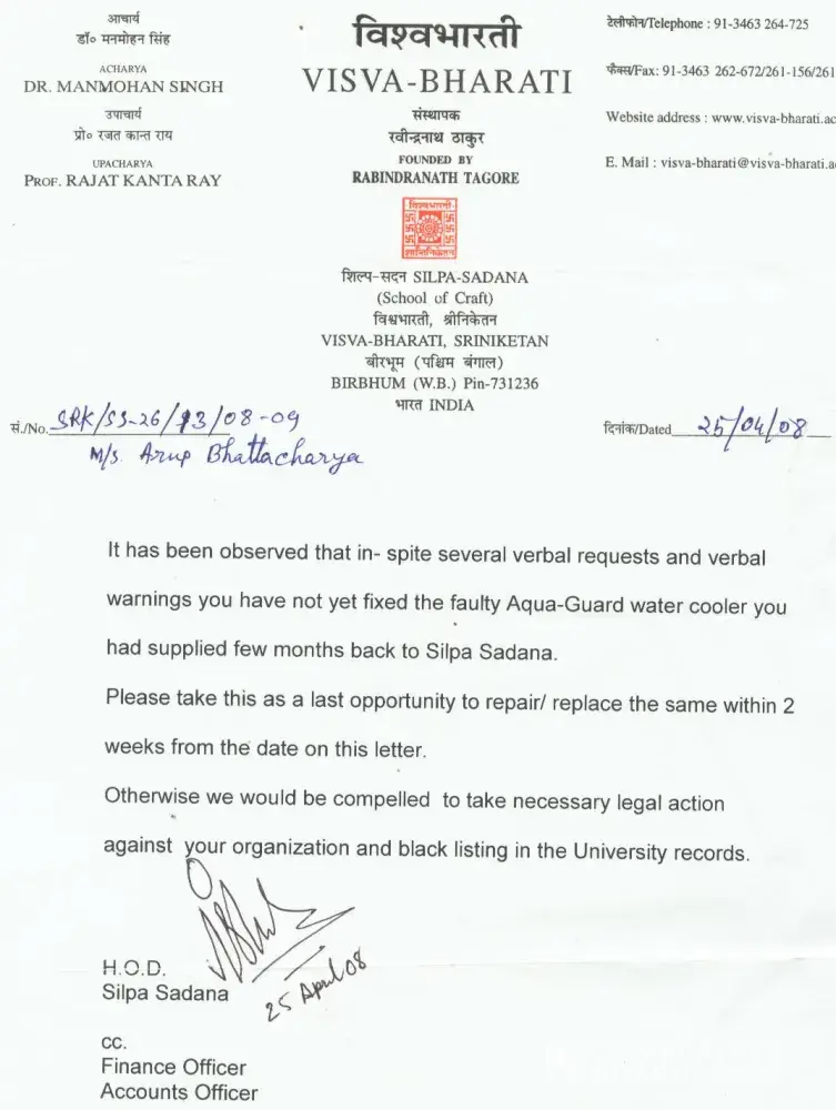 With deep regret I write to inform you that on 19.01.11 I replaced my old Aqua Guard water purifier with your ‘Aqua Guard Total Protect’ water purifier through your sales person Sri Bijoy Kumar Mukherjee vide your invoice no. [protected] dated 19.01.11.
