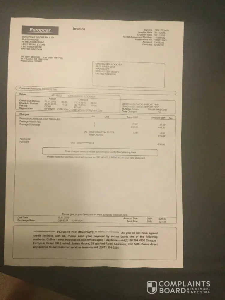 I would like to complain about my recent rental transaction (from 16 of February 2016) at London Luton Airport.