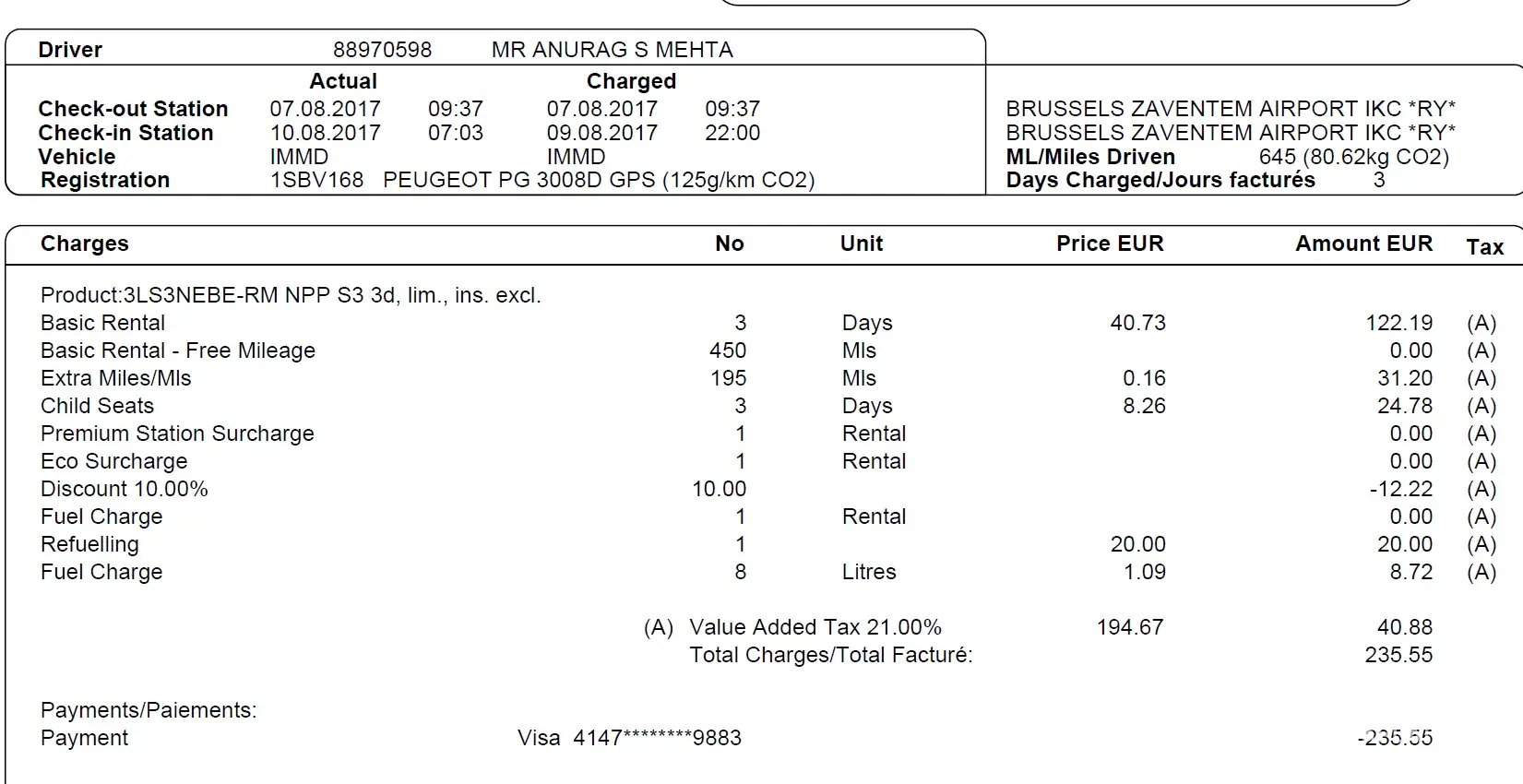 Having taken our credit card details, Europcar helped themselves to an extra days rental fee. They sent us an invoice claiming that we had collected the car whilst still flying over Belgium and returned the car more than a day late when we'd been home for nearly a day! Europcar are stonewalling and lying to our Credit Card company who don't seem to be trying too hard for us. Having scoured the internet it seems that kind of practice is widespread within Europcar. It is probably even in their business plan!