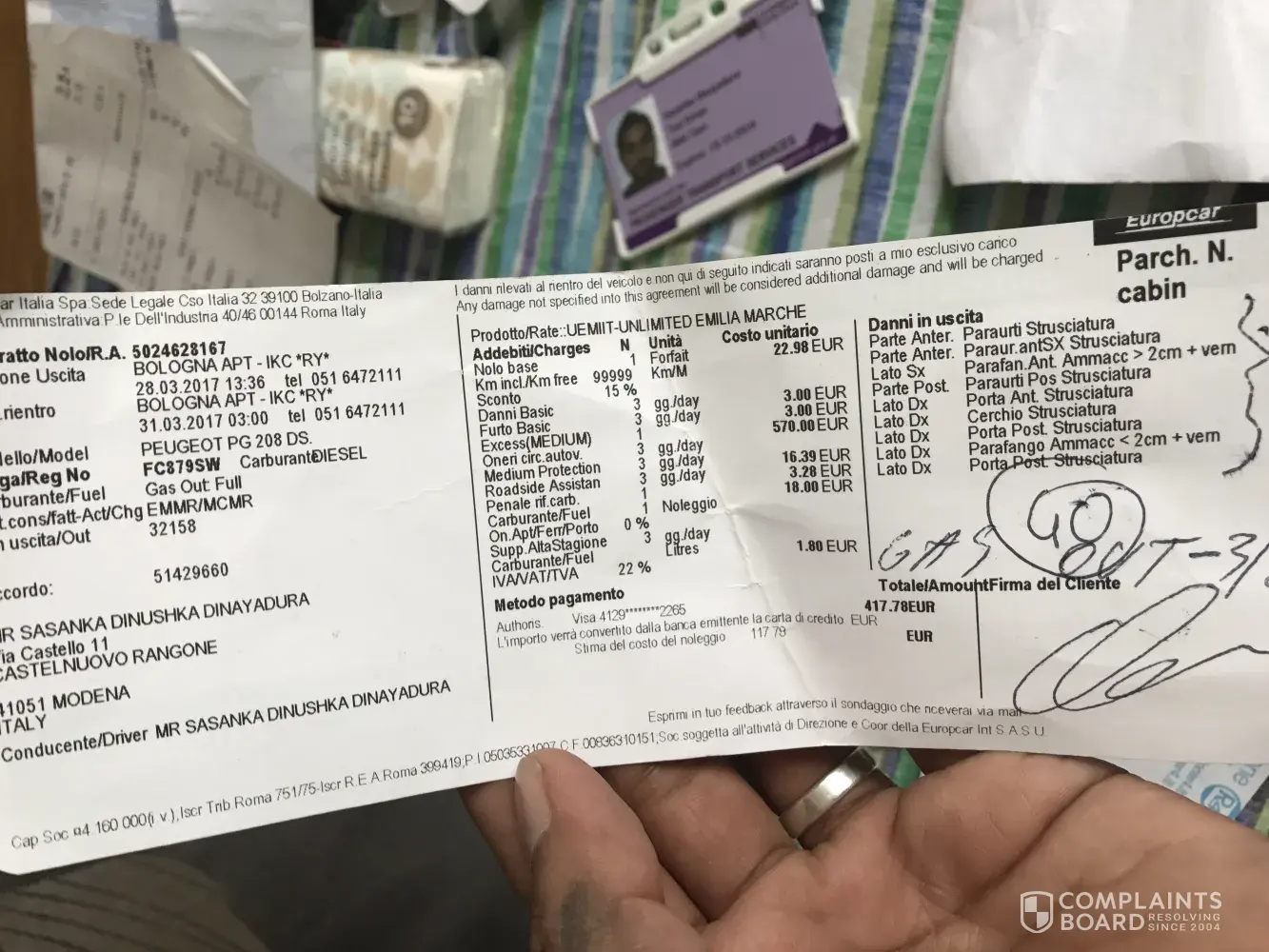 The next day my partner was checking his credit card statement online and saw the holding deposit from Europcar and was incredibly shocked to see the amount. We were very confused & didn't understand why it was so much. When we got to our next destination we got out our paperwork and tried to work it all out. This was all written in Italian so we could not understand anything that it said except the amounts. EUR1048.87 We tried calling Europcar Customer Service, the pick-up counter in Rome, no one would answer our calls. We tried calling Australian Europcar to be told they couldn't do anything. We spoke to our travel agent in Australia who tried to help bu they couldn't either as it was all in Italian. They said we had to deal with the company in Italy.