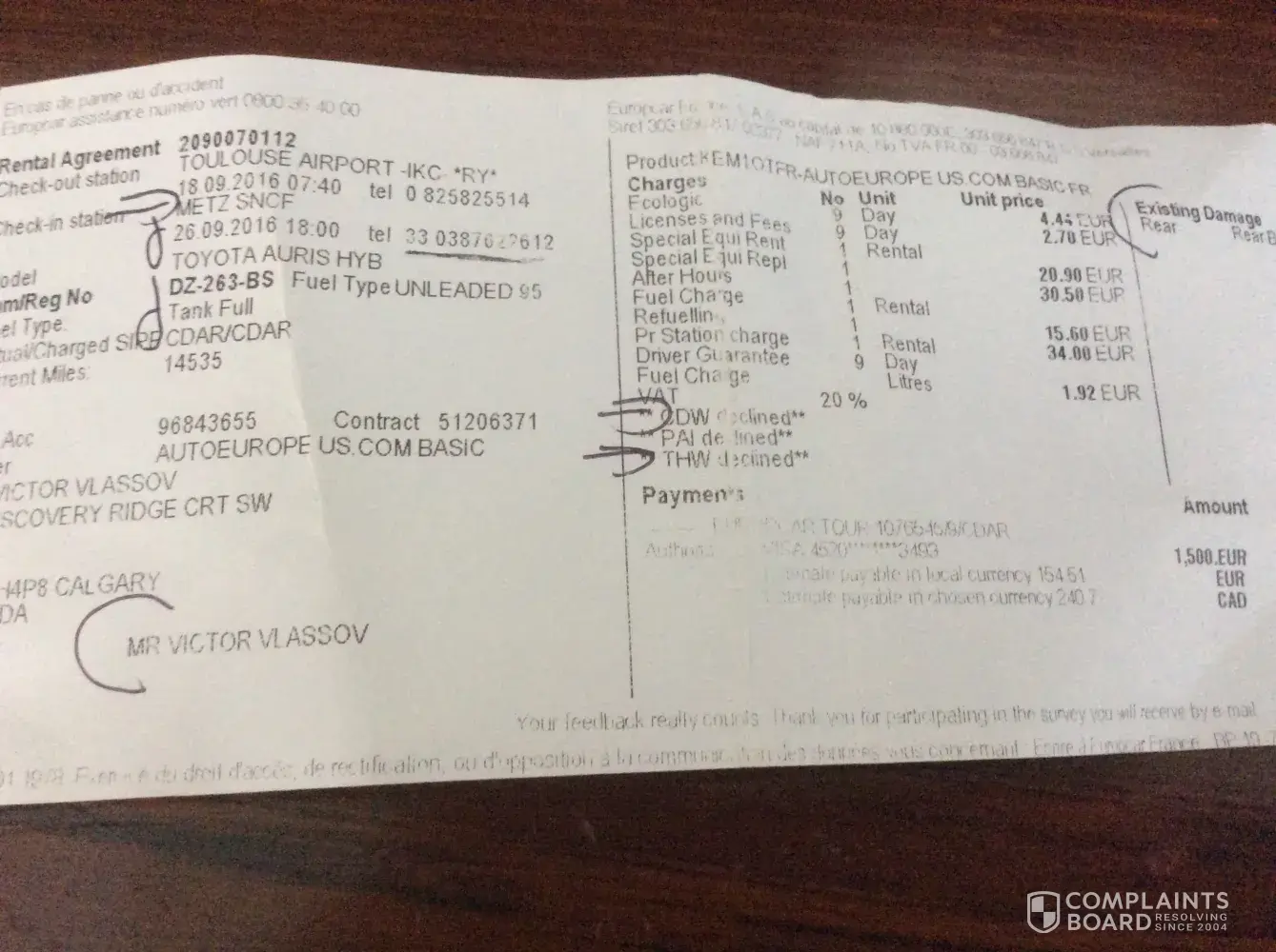 Rented a car out of toulouse airport and returned at metz location during business hours. The vehicle was returned with the full tank. Had a email correspondence with eurocar back and forth for many months. Eurocar was unable to provide an explanation about after hours charges of 30.50 eur and refueling charges of 15.60 eur. Did not receive any answer to my questions meaningless email exchanges, asking "to wait for investigation" eurocar customer service in france was also unhelpful. I was asking for refund to my credit card. Have used other rental car companies in europe and never had the same issues of overcharging. The eurocar company advertises itself for no hidden fees.in my case it proves otherwise. Regards Victor Vlassov. Email. [protected]@gmail.com