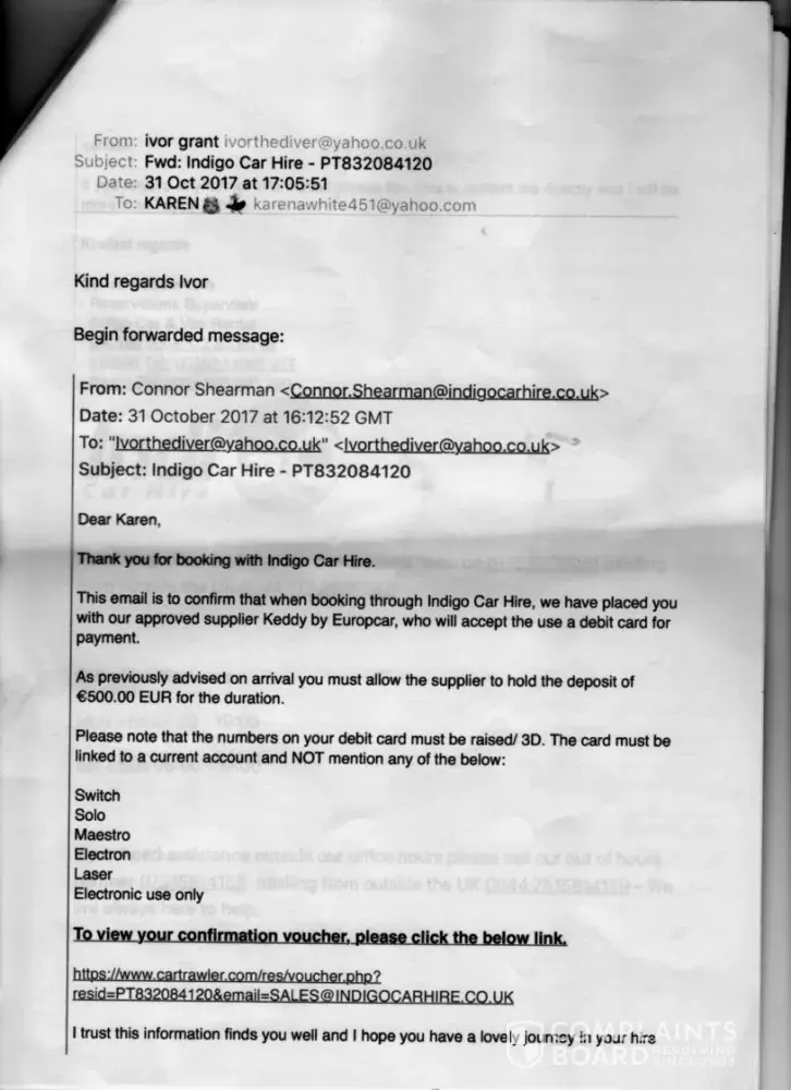 our contract was with indigo car hire and the staff member was Conner Shearman and our contract number was PT [protected] 0n the 31st October 2017 when we were advised of price and payment of 81 Euro's payable at collection point and we agreed to a payment of £34.53 to secure the booking .