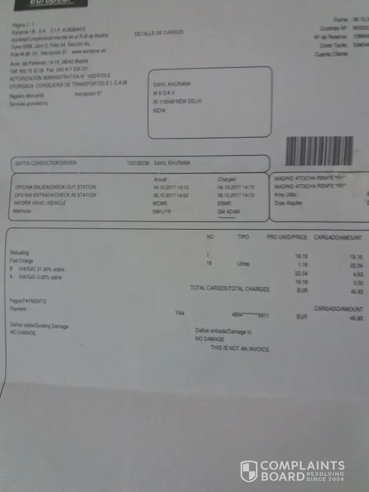We then complained and said that this charge was incorrect as there was no extra damage and we did not need to submit an accident report, and as per the contract, any suspected damage should have been communicated to us with the allowance of 14 days to dispute.