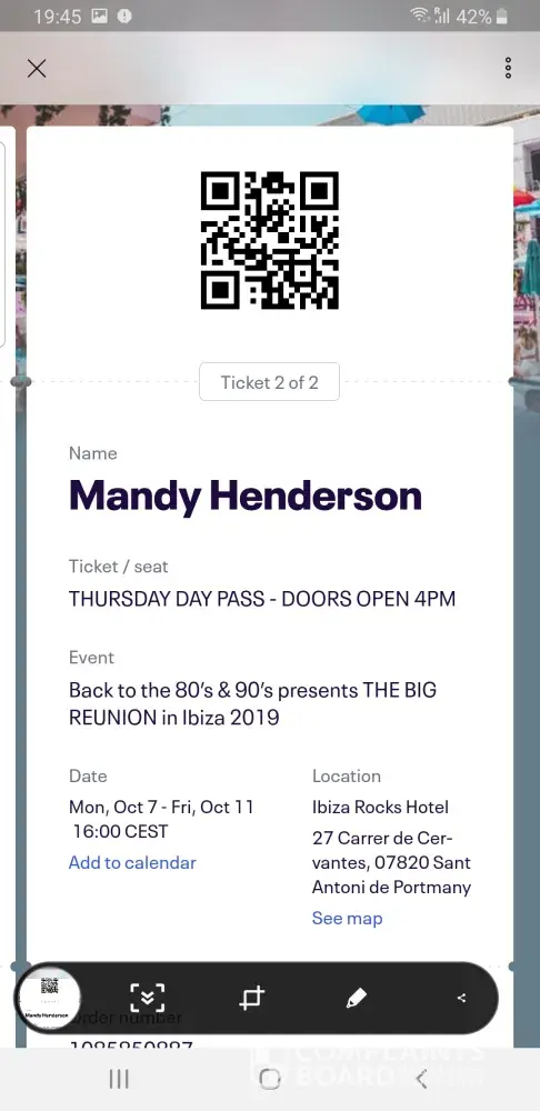I purchased 2 tickets for the above event for My Daughtets Birthday as a surprise (only reason I booked Holiday to Ibiza) It was to see her idol Ian Van Dahl we arrived at the event and spent 2 hours listening to Jive Bunny James Dean and Lasco to be then told that Ian Van Dahl was u able to attend and she was the headliner for this event. My daughter was extremely upset and I found this to be a waste of money as we left after the announcement. I'm wishing to be considered for a refund as this wasnt the experience I had paid for.