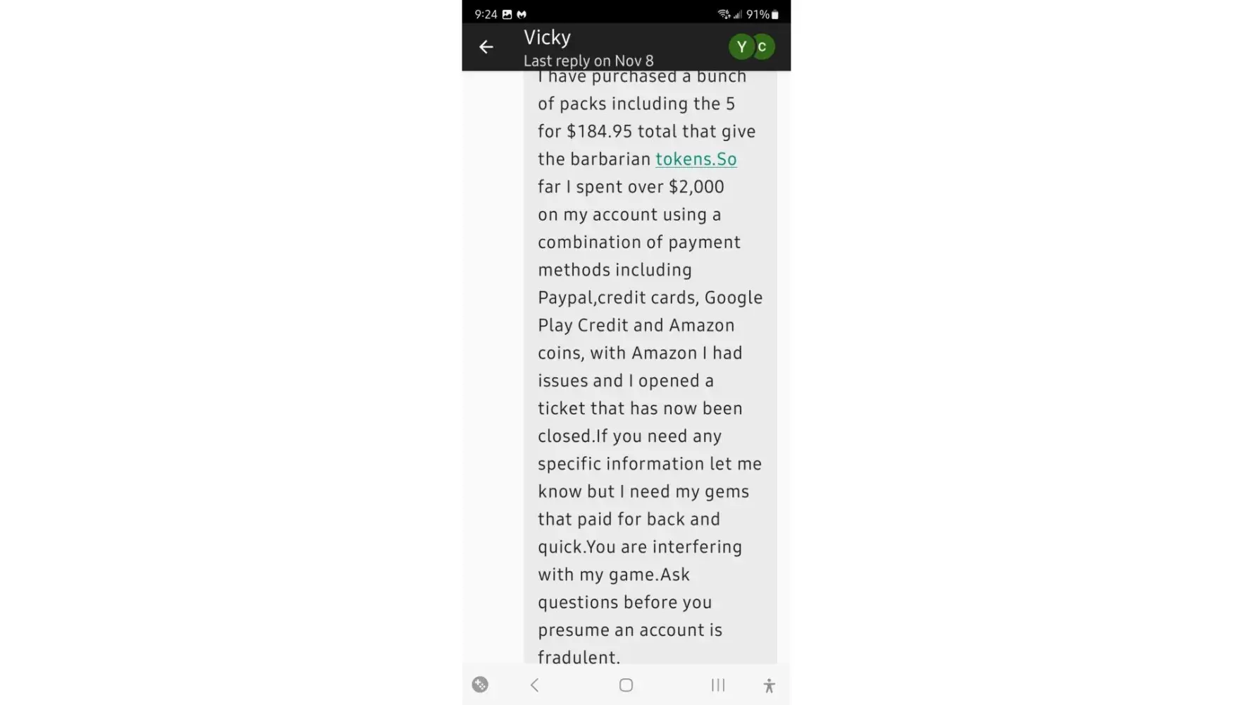 On November 2nd I logged in my Evony account and saw that over 2.1 million gems from my account were gone and I had 0 showing.I saw an in game mail accusing me of fradulent activity and purchases and for that reason the gems I had about $1,000 in value have been removed(as of now that customer support mail has been removed from my messages by customer support).I have opened a ticket and also sent email to customer support asking what transactions they were talking about and I offered to show them proof of every in game transactions I made that would prove it was done using my credit cards, paypal,Amazon coins.In one of the emails I received they asked me what do I think triggered my account to be flagged.Really?How do I supposed to know.After they said they will investigate next thing I see is that my ticket wad closed without any follow up or resolution and I received an email saying that my gems will not be returned until I pay back money I owned to Evony, again no ammount, no proof no transaction mentioned as it will show in the screen shots I attach.