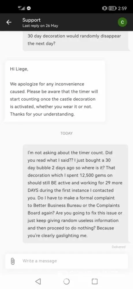 I bought a 30-day castle decoration for 12,500 gems exactly 3 days ago, which was Friday the 24th. I put it on my castle and logged off. Then I logged back on the next day in around one hour and 20 minutes before svs started. The decoration was gone and no longer active. I searched for both my gems and found I still didn't get the 12,500gems back and that...