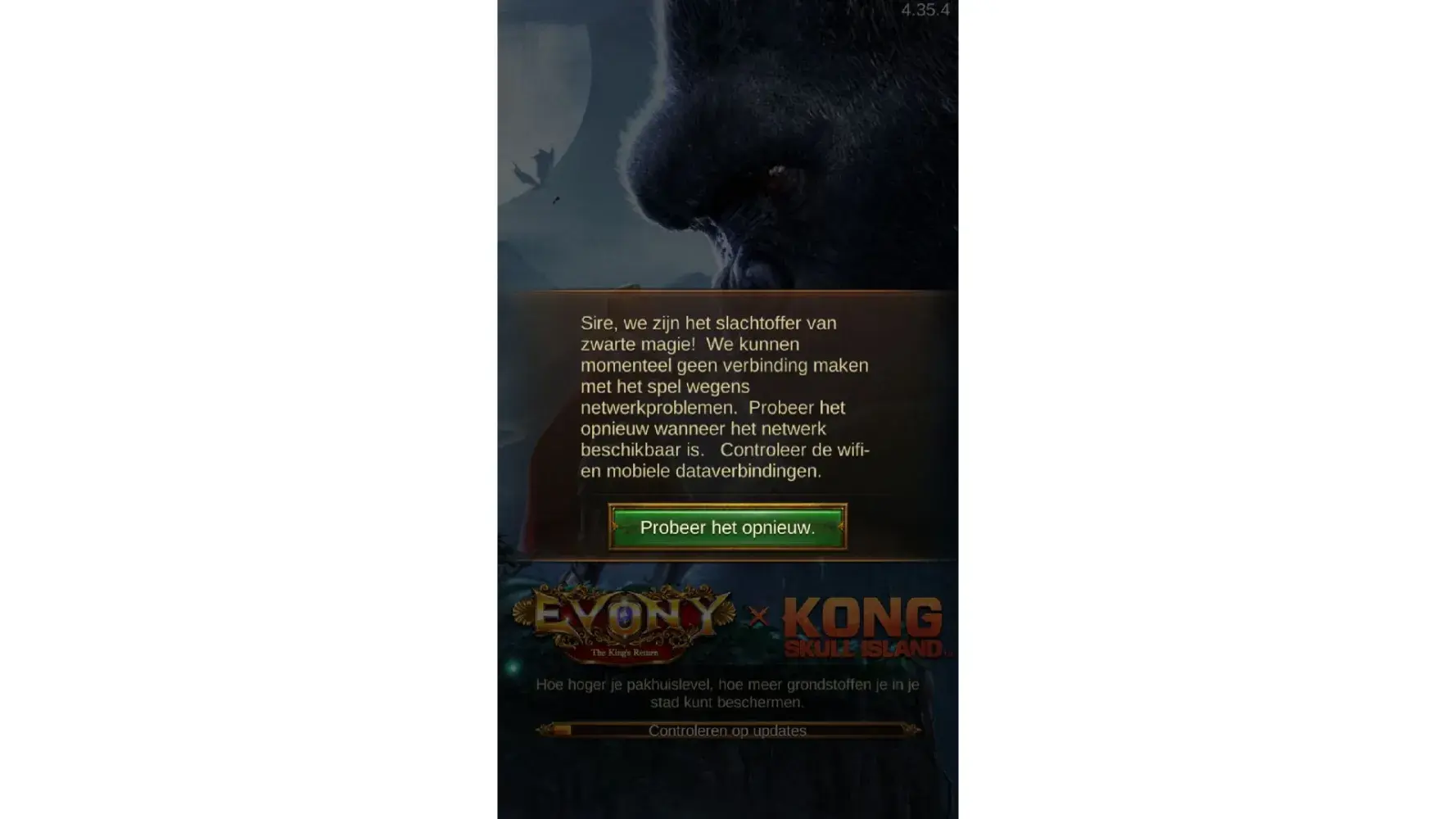 "Sire, wij zijn het slachtoffer van zwarte magie. Wij kunnen momenteel geen verbinding maken met het spel wegens netwerkproblemen. Probeer het opnieuw wanneer het netwerk beschikbaar is. Controleer de wifi- en mobiele dataverbindingen".