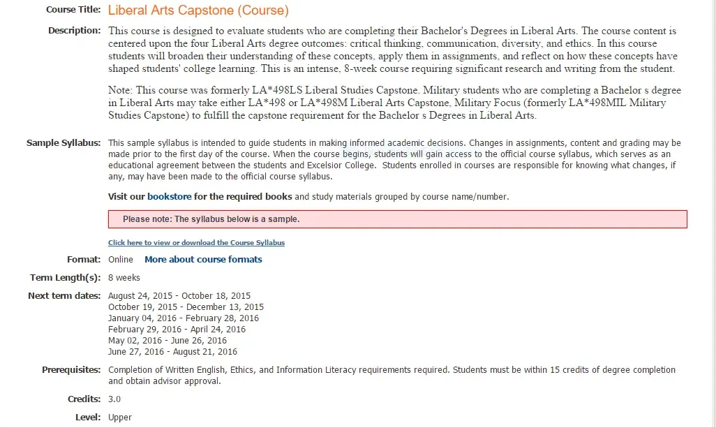 I took an earlier version of Excelsior's Liberal Arts Capstone and got a good grade. I would not take it again. The Power Point presentation was among the least of the problems I saw with this class. I can't speak to their capstones in other areas. In a program more focused than Liberal Arts, a capstone course might be relevant. If you are thinking about applying to this school, my advice is to make sure you know what you're getting yourself into right from the start. Carefully look over a sample syllabus for your prospective program's capstone. Excelsior has them posted online, but in a place that can be hard to find. If you have trouble finding the syllabus, ask an admissions counselor to e-mail it to you. If the capstone is a class that you don't think you'll benefit from taking, move on. By all means, do this before you even start your application. You do not want to be locked into an enrollment contract with this school, and then find out that your capstone is a deal breaker.