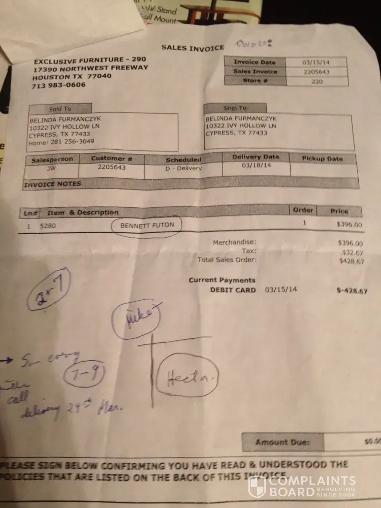 My 80 y/o parents purchased 20k worth of furniture to furnish most of the new home they recently purchased after living in the same home for 50 years. The sales person who sold them the furniture told them that it would be delivered on Thursday 10/2 because their warehouse was “closed†on Wednesday. Store told them they would be receiving a phone call...