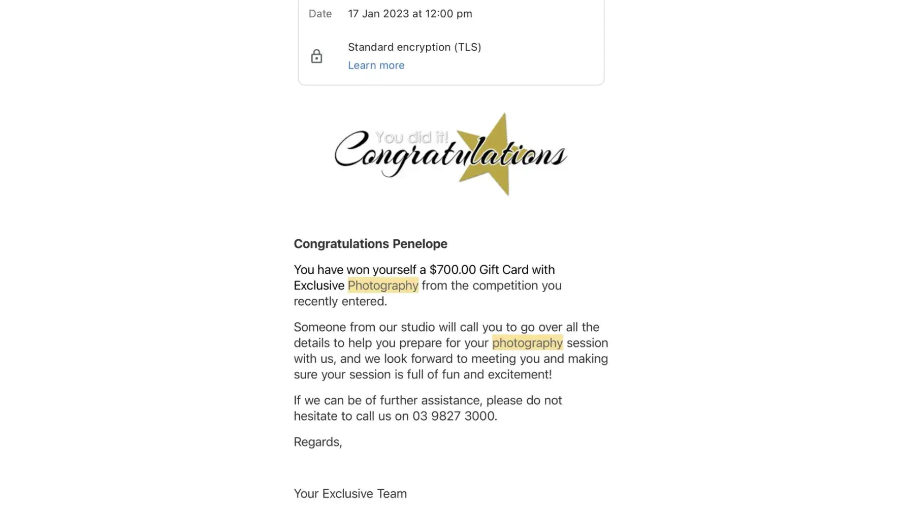 I apparently WON a $700 voucher with a photo shoot and $395 for photos. I was so excited and gave this to my husband for his birthday for a couples shoot. BUT this company is a scam! It’s a NOT a prize, it’s a small discount off there hugely over priced packages with the cheapest package being over $1500 for 4 small prints! Don’t believe what this company says. I’ve reported this SCAM to the ACCC and hope it’s investigated promptly.