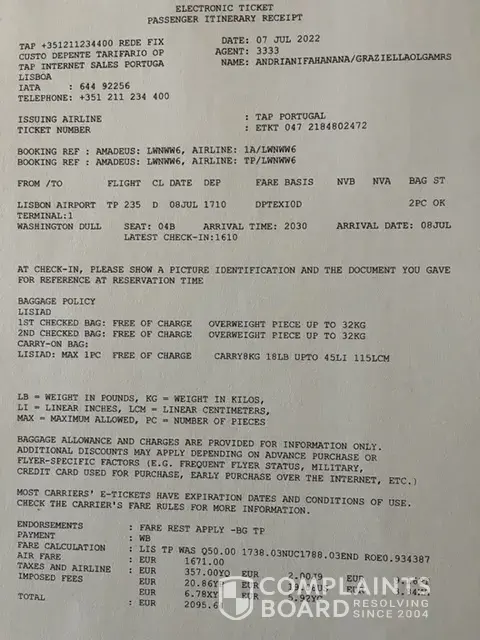I purchased a flight in the amount of $648 dollars on February 6, 2020. The trip was from Rome  Newark under Itinerary No. [protected]. On the same date, another flight was purchased, for Anthony Giuliano under Itinerary No. [protected], also for $648, going from Rome  Newark. The flights were cancelled on April 22, 2020 and May 9, 2020, due to the ongoing COVID-19 pandemic. Specifically, Tap Portugal cancelled the departing flights to Italy, thus requiring the cancellation of the returning flights.