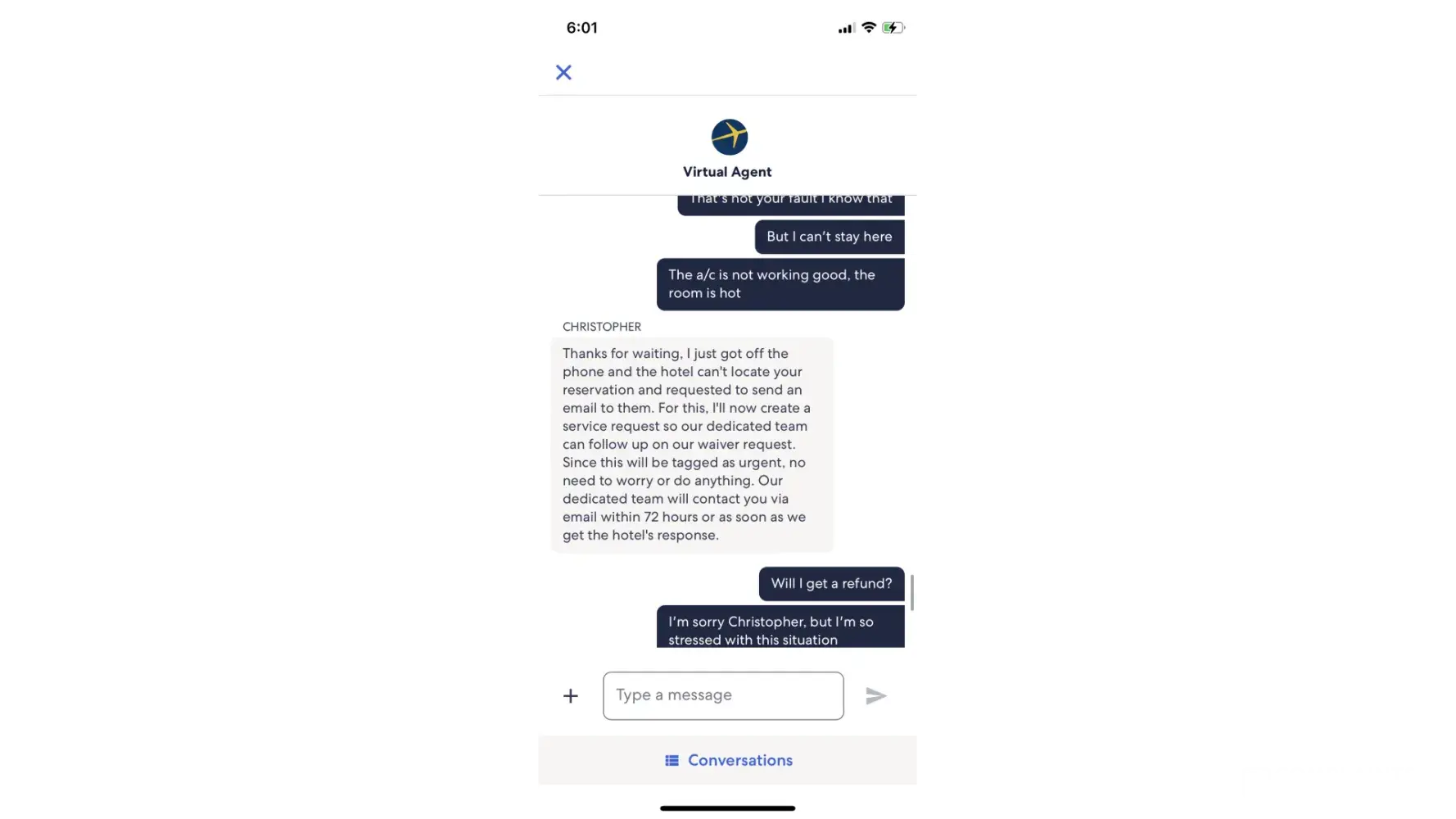 I have tried calling, online chat, and two different email addresses for Expedia. No one ever comes on the line for my call, online chat turns off before an agent comes on, and the email addresses come back as not valid and direct me to Expedia's website, which gets me nowhere!