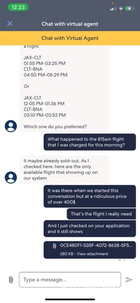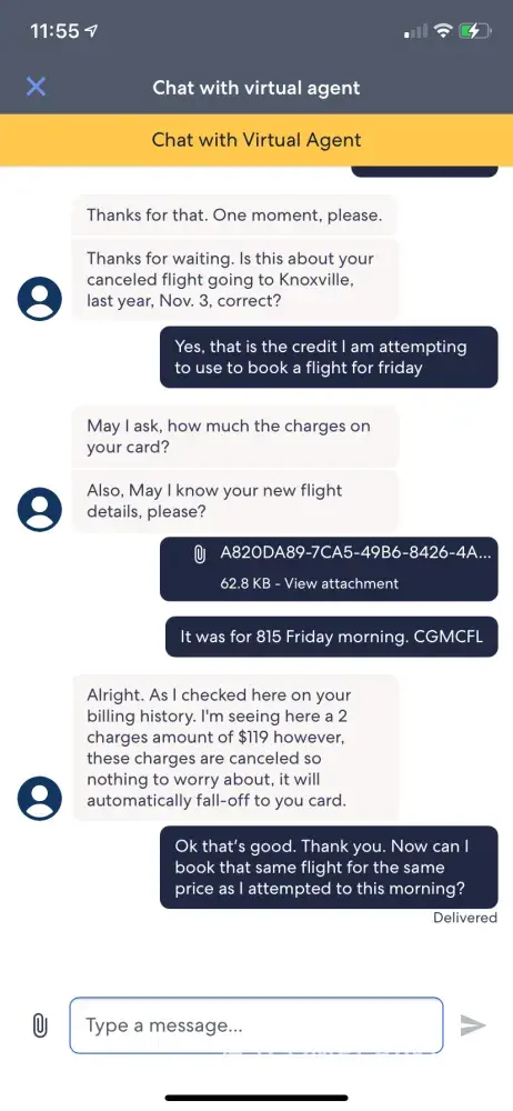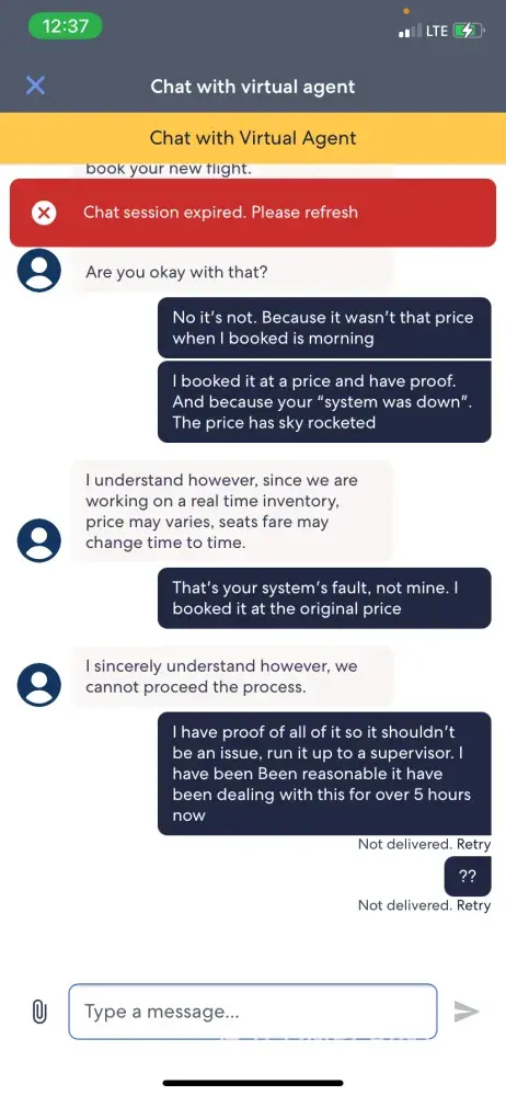 This is a joke. I said I wouldn't use them anymore after the last debacle, but I still had a credit and needed to book a flight. simple right? Well, I click to use credit and my flight was 119$ after credit so I was happy to pay the remainder. Well, while processing, the "system was down" so I tried again several minutes later. same thing! I look at my bank account and it has been charged THREE TIMES! I call and call and it will be at least a 4 hour wait. HA! so I get on the virtual chat in the app and get someone in about 6 minutes. Now my flight has went up 300$ and wants to charge me that price instead of when I booked it. he asked if that was ok and I said no, I wanted the price it was when I booked it. That I had proof of it all and he said he cannot proceed and disconnected the chat. This chat took over 45 minutes. I have screenshots of ALL of it. Piss poor customer service. I never want a hand out but I served in the marines and this is the [censored] I went to combat for? garbage man, pure garbage and im not even an [censored]. I NEVER report bad customer service dealing with this for 6 hours has made me irate. you can email my ghost email if anyone has anything to say @ [protected]@aol.com
