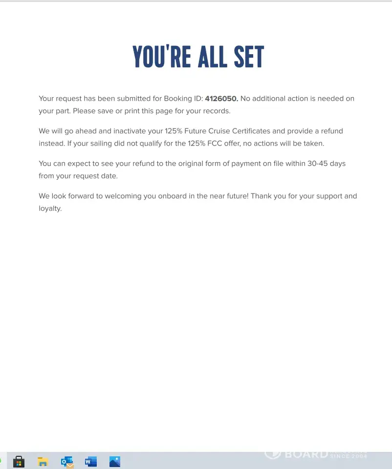 Expedia sent me a notice about the cancelled cruise on May 22, 2020. I was given a choice of cash refund and 125% future cruise credit. I responded on the same day, opted for cash refund. I immediately got a confirmation on the screen saying: "You are all set ... we will provide a refund ...within 30-45 days.". I was reminded many times not to contact them, because they will be busy. I was assured that my request would be fulfilled as promised.