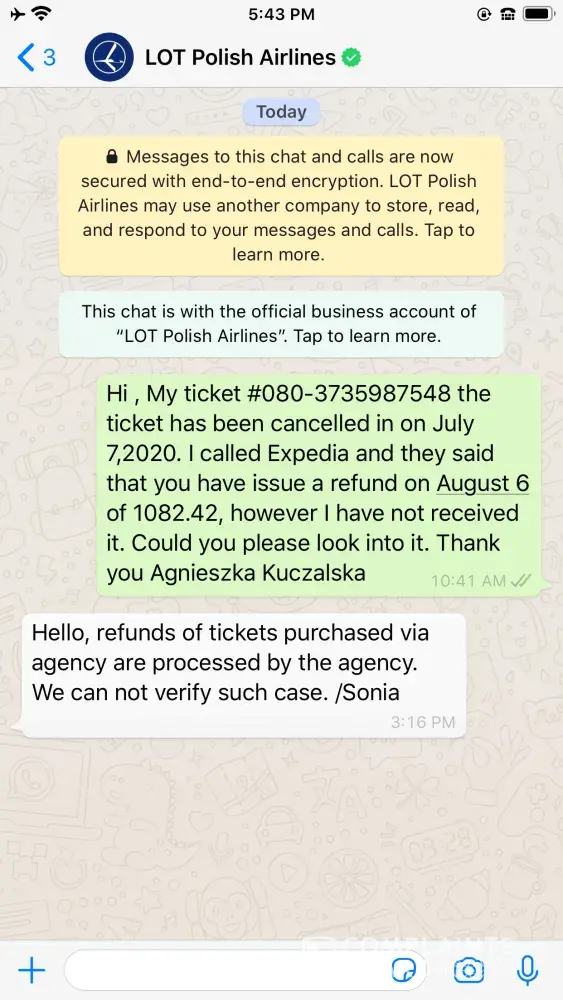 I booked flight to Poland through Expedia. The flight had been cancelled on July 7, 2020. I have not received refund yet. I was supposed to receive a refund within 12 weeks of the cancellation. It has been 26 and no refund of $1082.42. I have been calling Expedia every month and received same answer that the Lot airline delayed credits. I called Expedia on Dec 23 and the agent told me that I should receive refund at the end of the month. Since I have not received it, I called Expedia again on January 8 twice and agent Mike told me that I ‘am supposed to call Lot myself asking them for the refund. I did reach out to Lot and agent Sonia texted me (I attached the copy of the conversation) refunds of tickets purchased via agency are processed by the agency. I have also attached my ticket and the picture of the conversation with Expedia who can't find my bookings now.