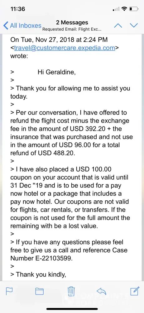 "As per your request, we have spoken to the airline. As per the communication, the airline market you as a "no-show'' as you were late for the boarding for your Expedia reservation. The flight was boarded using the fresh ticket that you purchased directly at the airport.