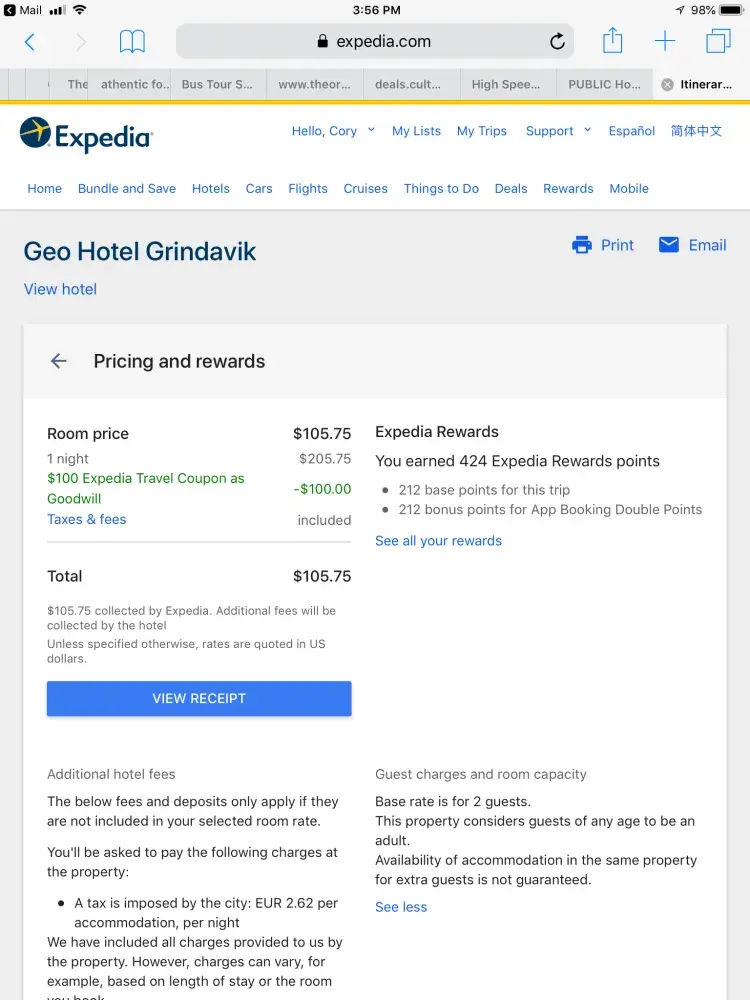 Thanks to Expedia we had an incredibly stressful and a completely ruined day in ReykjavÃk. I cannot emphasize enough how miserable we were. I believe once you review all the documents you will see that many mistakes were made and not by me. I expect to be reimbursed for the taxis and the hotel balance a total of $358.08.