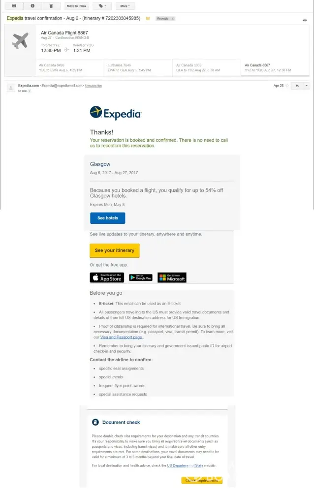 I booked a return flight to Scotland on Air Canada in August, 2017 flying out of, and returning to, Canada. I live in the United States. I have attached a copy of Expedia's Travel Confirmation showing the pertinent parts of the booking. I received nothing else from Expedia leading up to and during my trip.