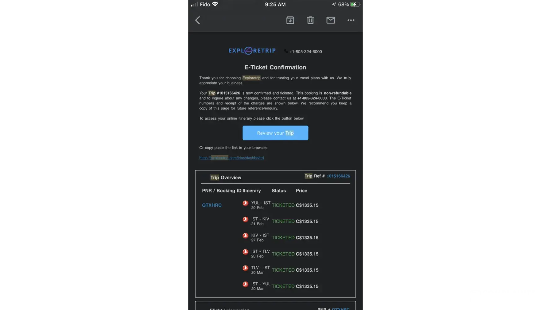 When I asked them to cancel next flight İstanbul to Tel Aviv-Yafo – TK 810, since I can't reach it in time, ExploreTrip refused. They insisted on cancelling all the next flights in the chain. The agent did not know the amount of the refund.