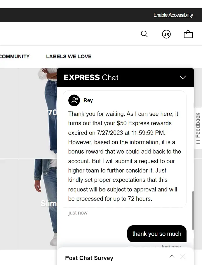 I'm done with Express. This is definitely going to be the last time I support this company. It's not worth my time or money. I'll be returning everything I've ordered and taking my business elsewhere. And you can bet I'll be spreading the word about how rude, incompetent, and less-than-poor-quality-service ripoffs they are!