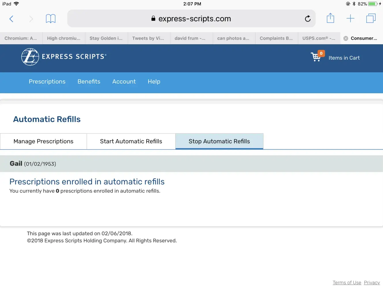I was Retired as of Jan 31, 2018 from US Bank and no longer have employee medical coverage. December 2017 I requested all my drugs stop automatic refill via the website. This was because I did not want to incure a deductible that I would have to pay for just one month. This was done in Dec. 22(?), 2017