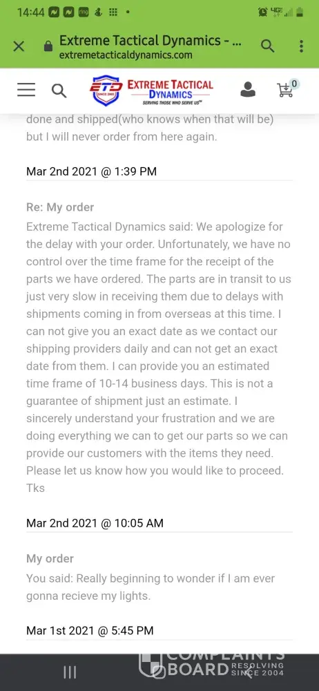 Extreme Tactical Dynamics said: We apologize for the delay with your order. Unfortunately, we have no control over the time frame for the receipt of the parts we have ordered. The parts are in transit to us just very slow in receiving them due to delays with shipments coming in from overseas at this time. I can not give you an exact date as we contact our shipping providers daily and can not get an exact date from them. I can provide you an estimated time frame of 10-14 business days. This is not a guarantee of shipment just an estimate. I sincerely understand your frustration and we are doing everything we can to get our parts so we can provide our customers with the items they need. Please let us know how you would like to proceed. Tks