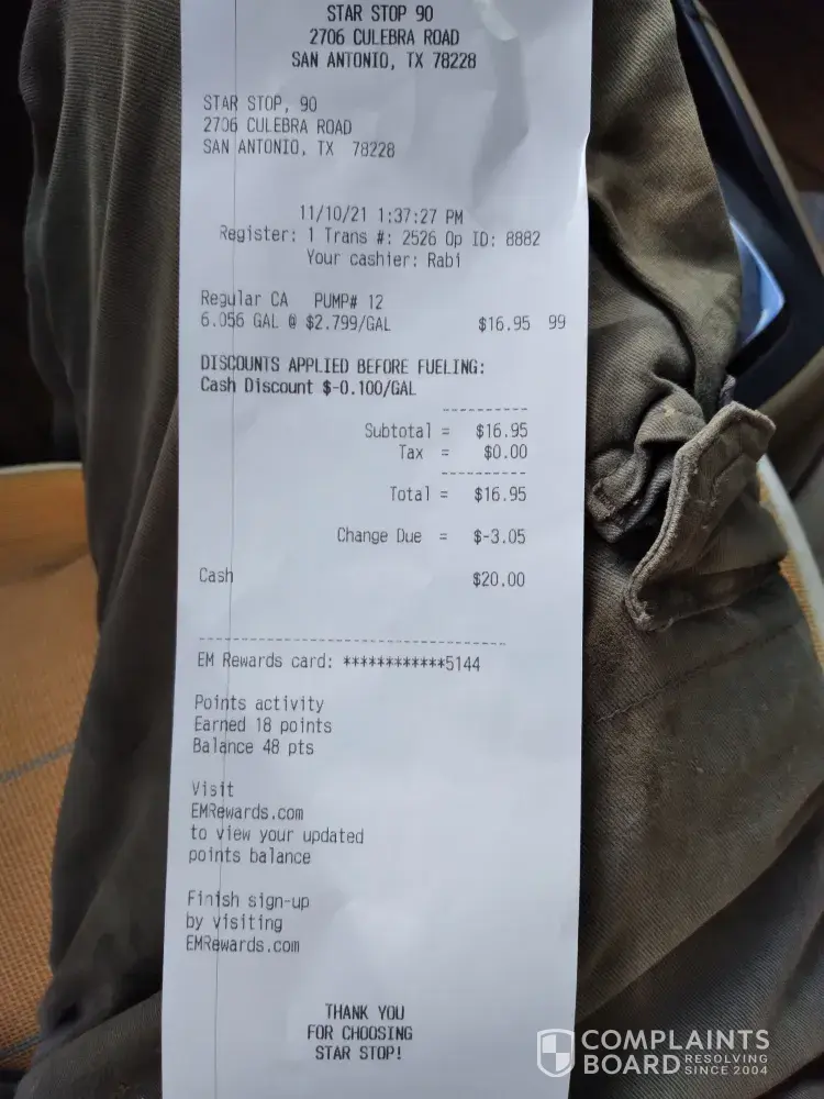 I have 251 rewards card in my email account on my phone. I tried to redeem the points. I was ignored by owners and cashier here.There address is 2706 Culebra Road, Star Stop 90.my recipe said balance 48 pts.I called 4 times to rewards phone number and was redirected several times to different complaints department then was cut off several times. What should I do. Help is greatly appreciated from you. Call me Mr. Robert Ramirez [protected]