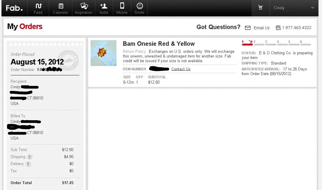 It looks like my first order with fab.com was my last. I ordered a one-sie for a friend's new baby on August 15 for $12.50 and $4.95 to ship it! Today is September 4th and with no item delivered, I went to the site and attempted to find out why it has not yet arrived. Imagine how frustrating to find out that they claim it would take 17-26 days to ship. So I called the company and a very dim Customer Service rep informed me that there was a delay in getting the item. Great. So now, no item and no updates to explain why I'm still waiting 20 days later. I told him to cancel my order. Now, I have to wait for an e-mail to confirm the cancellation. I'm now seeing that many customers are being charged multiple times for things. I had better NOT be charged for ANYTHING.
