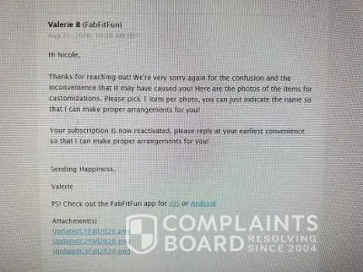 FabFitFun Even though it took a long time to get a response from FFF through the live chat option (I had actually given up and