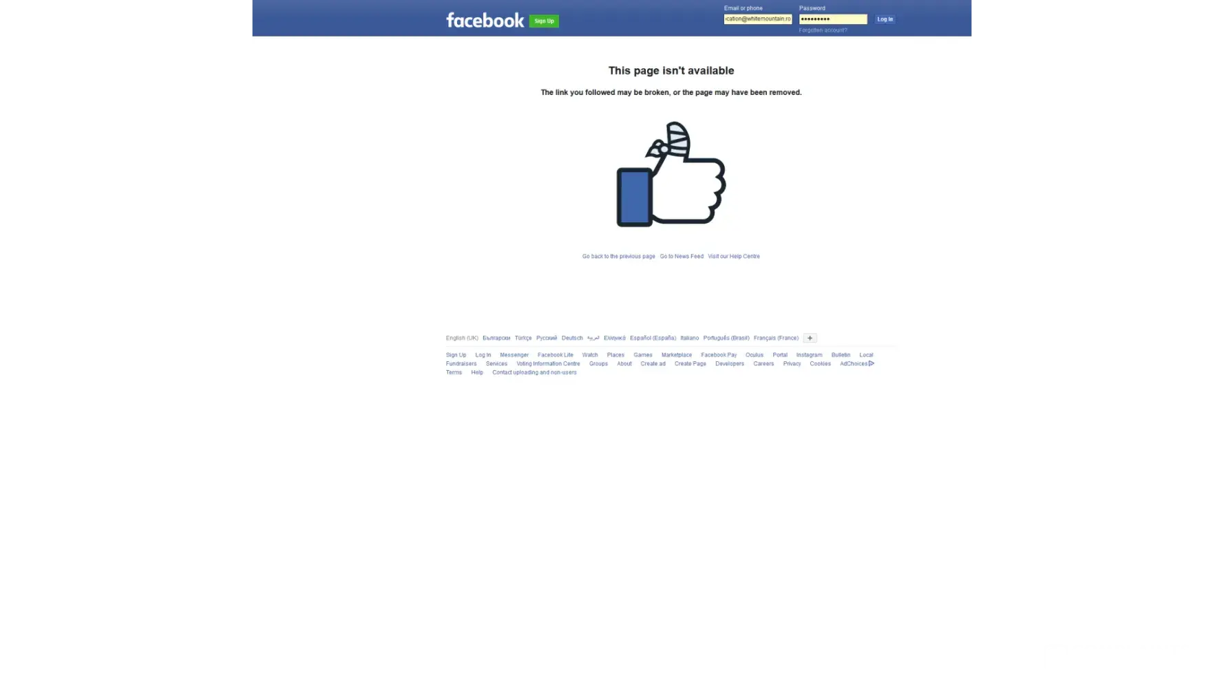 if offeres an alternative method of logging into a non existent page, fb.me/soething I forget, whihc takes you to this non existent page