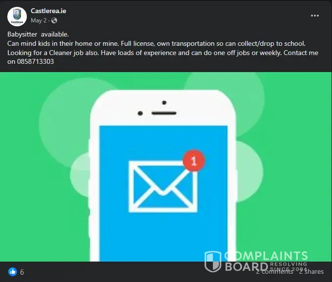 Emmie, my friend and also a Facebook user, receives a friend request from a profile claiming to be a certified babysitter and cleaner. You can view the Facebook post [here](https://www.facebook.com/castlerea.ie/posts/pfbid02mTj3kcZkWZ99ccsvuJHia2QL7xrSwsCfzBPPno6khvwC4MgJu3cpKGsaitgRWc4tl).
