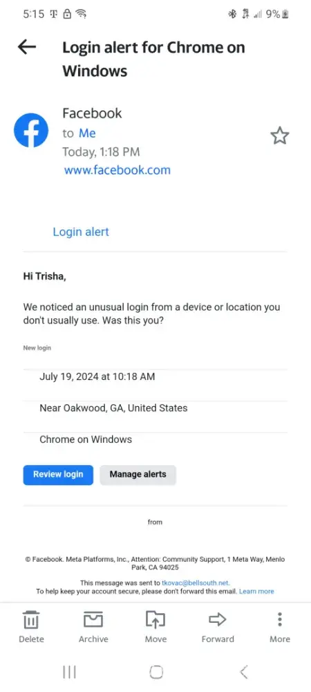 On July 19, 2024 at approximately 1:15pm, I was notified by Facebook that an unusual login was attempted from a device or location I don't usually use. I pressed the "NO" button and was redirected to change my password. The password link stated that my Facebook account was to new to change the password.