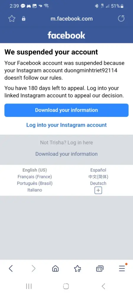I attempted to log in to Facebook a few minutes later and was met with a message that my account was suspended. The reasoning is that my linked Instagram account, (duongminhtriet92114) doesn't follow their rules. That I am able to appeal for the following 180 days by logging onto said account.