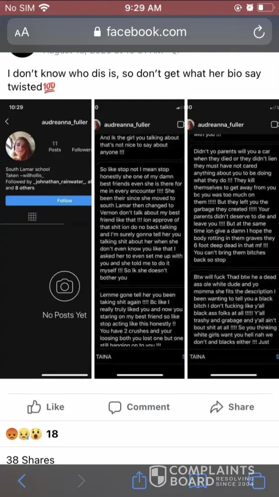 Facebook allows children to make accounts without showing Id or proof of age . This is what happened a child had a Facebook account which was threatening and had my child name (daughter) name signed onto a post that was made on this social media account and it has threats, rude comments and people have been coming knocking on the doors and tormenting us concerning Facebook. Some of family members have been reporting this but Facebook refuses to take it down . I feel in my opinion that children should not be allowed to get on Facebook without showing id or proof of age . This would prevent children from being threatened, bullied, harrassing, or involved with the law enforcement. We cannot fault the children for this we should fault Facebook cause they should make it mantory to show proof of age . Proper id before making an account if not force them to shut it down. I would like to be compensated for all the stress and mental anguish and I'm fear of out life . We are constantly looking over out shoulder every day and we cannot have peace . No one deserves this so please put a stop to this and make it mantory that they do not let children on Facebook and require id that's proper to who they are .