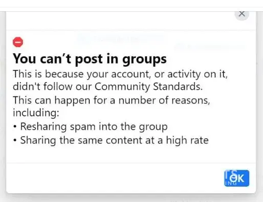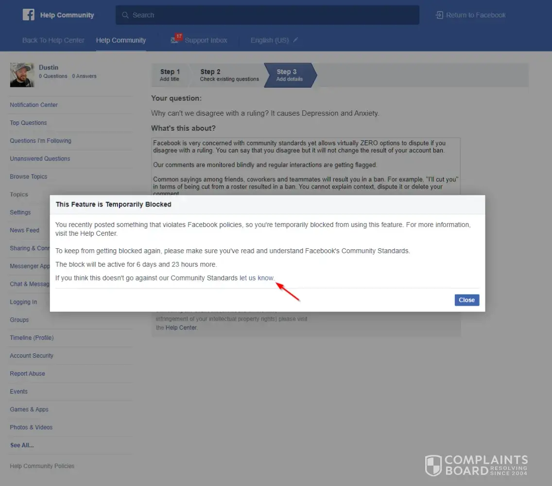 Even when you want to click help on the community pages of Facebook you are blocked from posting. You are given a link to explain why it is a mistake but that link does not work.