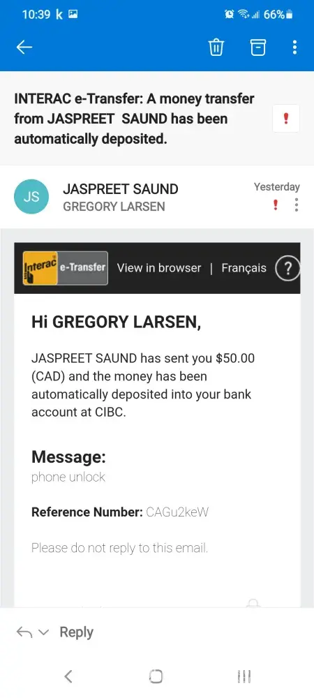 and the etransfer when he paid me for the phone repair.