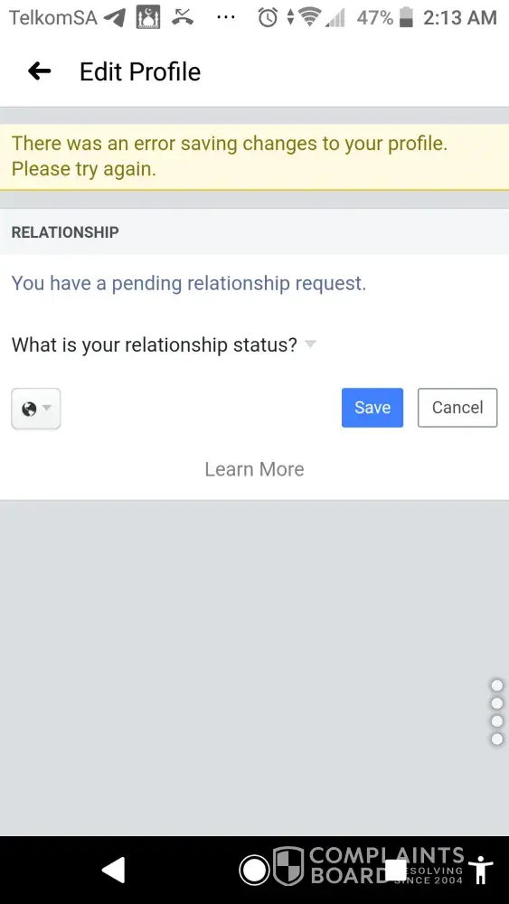 Trying to change my relationship status back after deleting it. Now it won't save the changes to on a relationship again and just says and error occurred while trying to save changes, please try again later. It's been doing this for over a week now. I confirm her request and it gives me that message and the request comes back up as pending. I've tried logging out I've tried restarting my phone, even logged into a computer and nothing helps