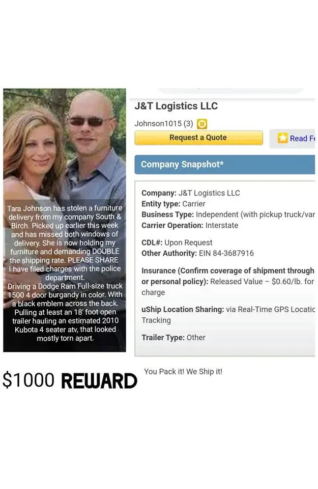 I contracted with a USHIP shipper to deliver furniture from Alabama, 4 1/2 hours, to Mississippi. Tara Johnson, J&T Logistics, took my furniture 15 hours north to their home in OHIO. After posting my stolen poster all over Facebook I was contacted by concerned citizens and family members and told my furniture had definitely been stolen. At this point USHIP FINALLY stepped in and suspended the shippers account. After much pressure from her town and family my furniture was enroute south.