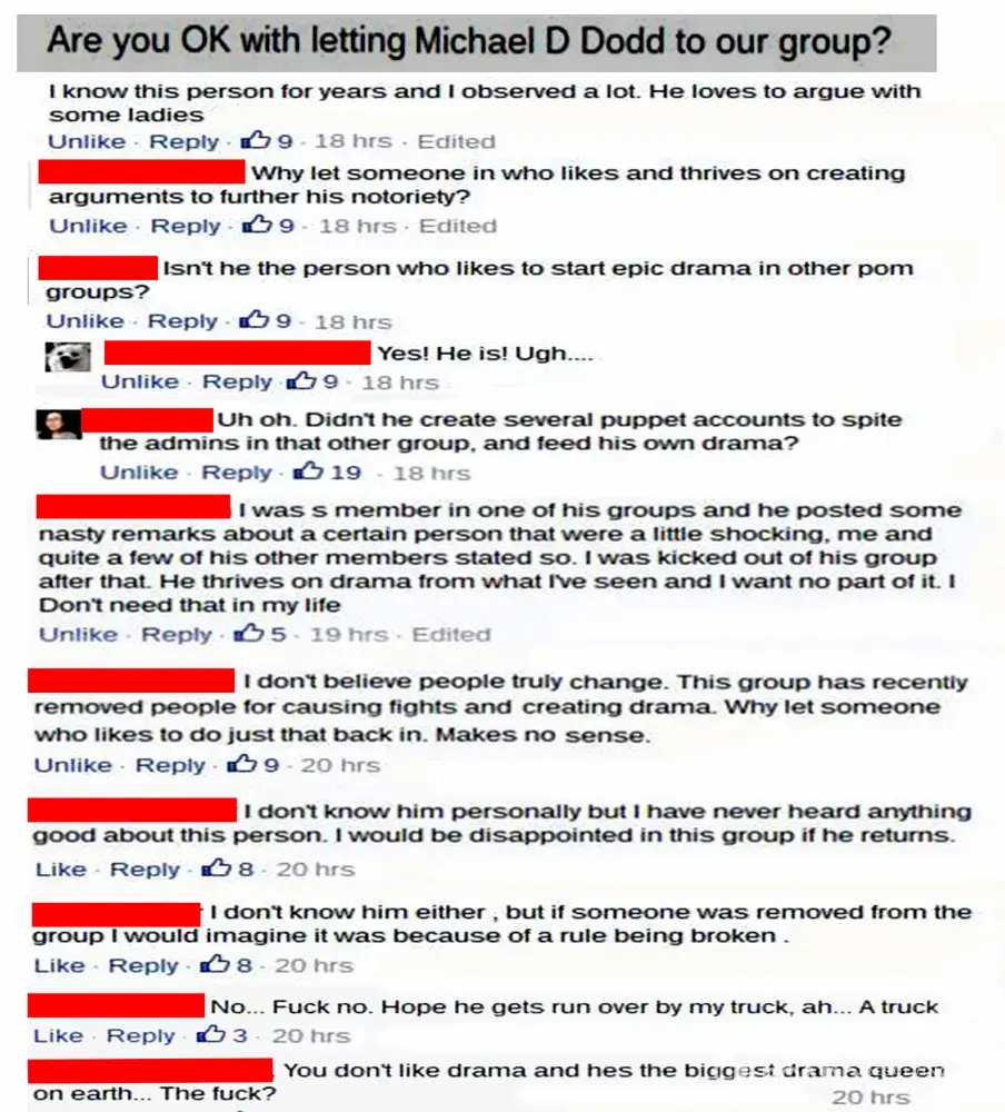Michael D Dodd also appears under name Michael Justice. ... here as this person has threatened me to come to my house and hurt me if I tell people the truth or I report her. ... All is screenshot and saved, try to figure out who is doing it. ... @Michael Dale Dodd Whereever there is a war - your are ALWAYS in the middle of it.