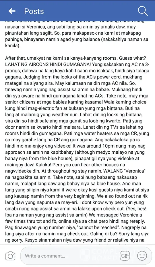 A lady (obviously not the care-taker) approached one of our family members and told her na ang bilin daw ni Veronica na wag kami papapasukin hangga't di nababayaran yung balance. Who the [censor] does that to his/her guests?! We drove for hours thinking na makakapag relax kami pag dating namin and then this? I would understand kung hindi kami nagbayad at all. Tinanong namin kung nasaan si Veronica, ang sabi lang sa amin ay umalis daw, may pinuntahan lang saglit. So, para makapasok na kami at makapag pahinga, binayaran namin agad yung balance (nakakahiya naman sa kanila).