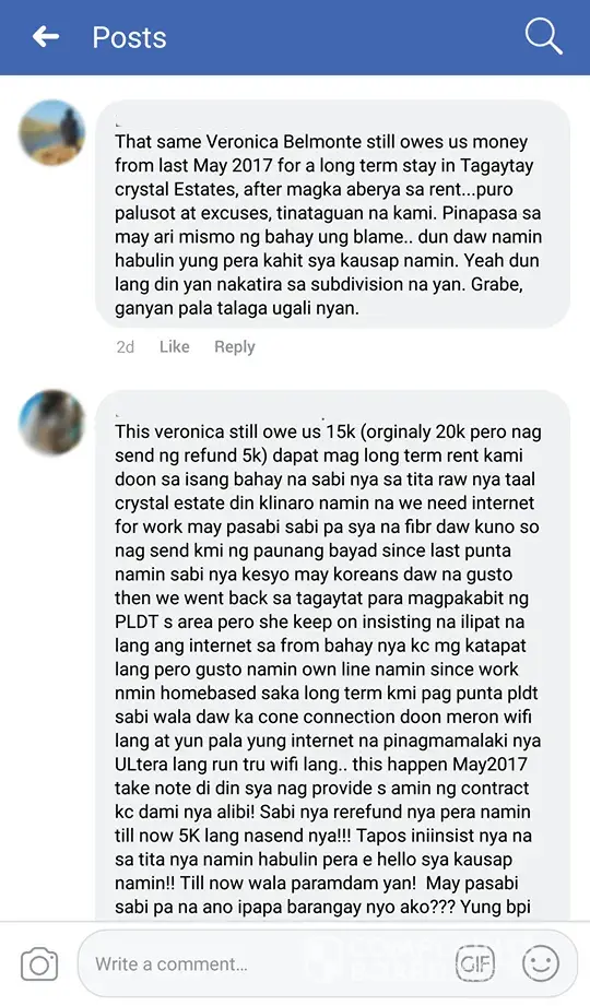 Veronica Belmonte from Taal Crystal Estates Tagaytay City / Alfonso Cavite was being complained in Tagaytay Escapade Facebook group for fraudulent advertisement and several more complaints such as owing money from previous rent transaction and being a no-show.